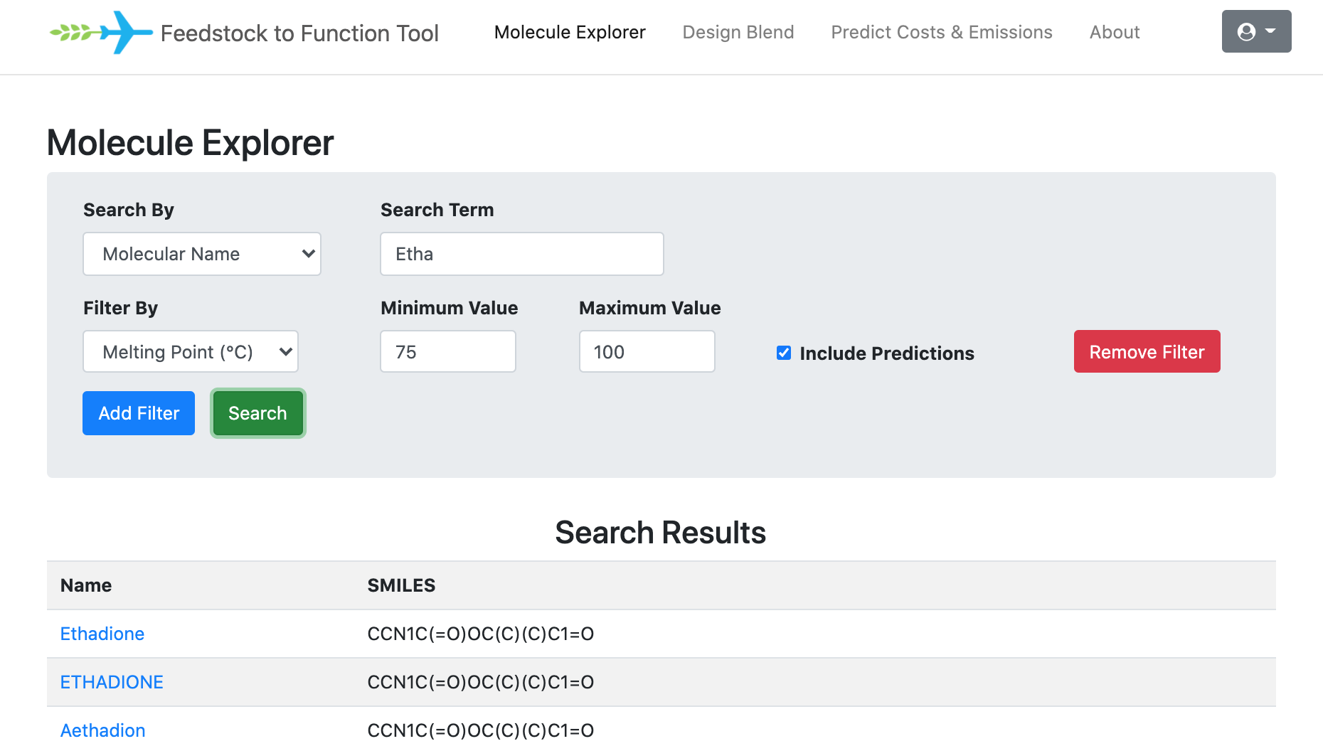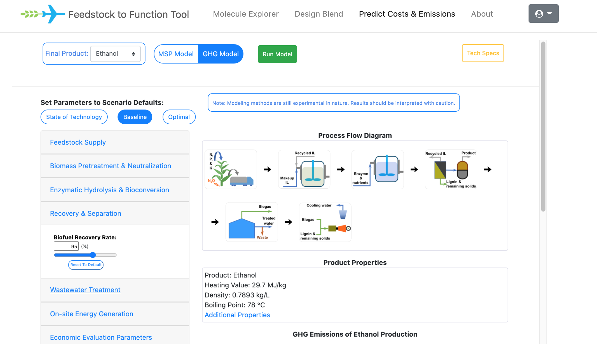 The Feedstock to Function Tool harnesses the power of machine learning to predict properties of high-potential molecules derived from biomass and evaluates the cost, benefits, and risk of promising biobased molecules or biofuels to enable faster, less expensive bioprocess optimization and scale-up.